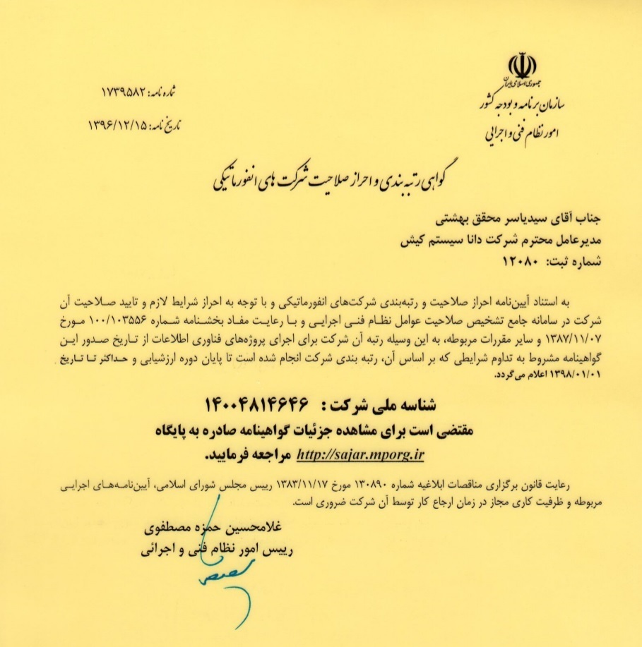 شرکت دانا سیستم موفق به اخذ گواهی رتبه بندی و احراز صلاحیت شرکت های انفورماتیکی شد. این مهم طی ارزیابی های متناوب از قراردادهای شرکت و بررسی توان انفورماتیکی شرکت محقق گردیده است.