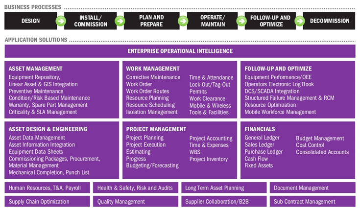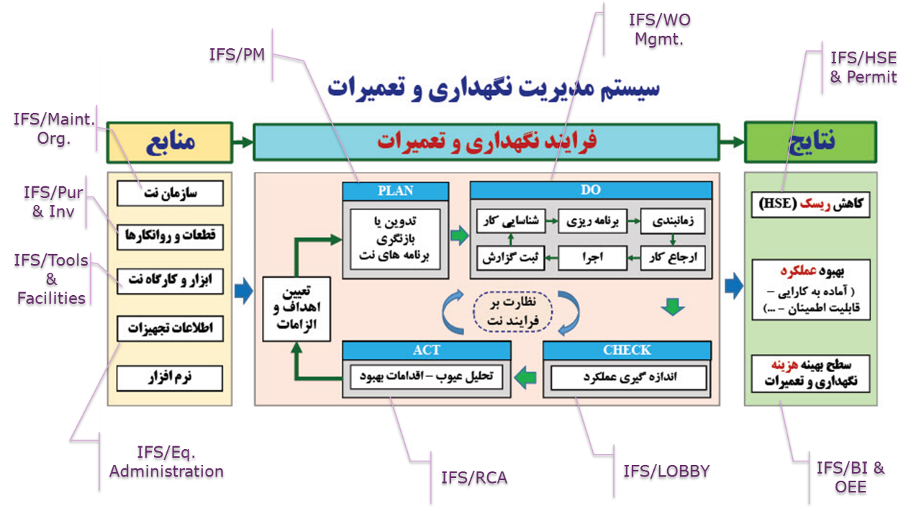 همچنین ماژولهای مختلف نرمافزار IFS براساس آنچه به عنوان سیستم مدیریت نگهداری و تعمیرات در استاندارد NORSOK اشاره شده است، نیازمندیهای سیستم مذکور را مطابق تصویر زیر برآورده می نمایند.